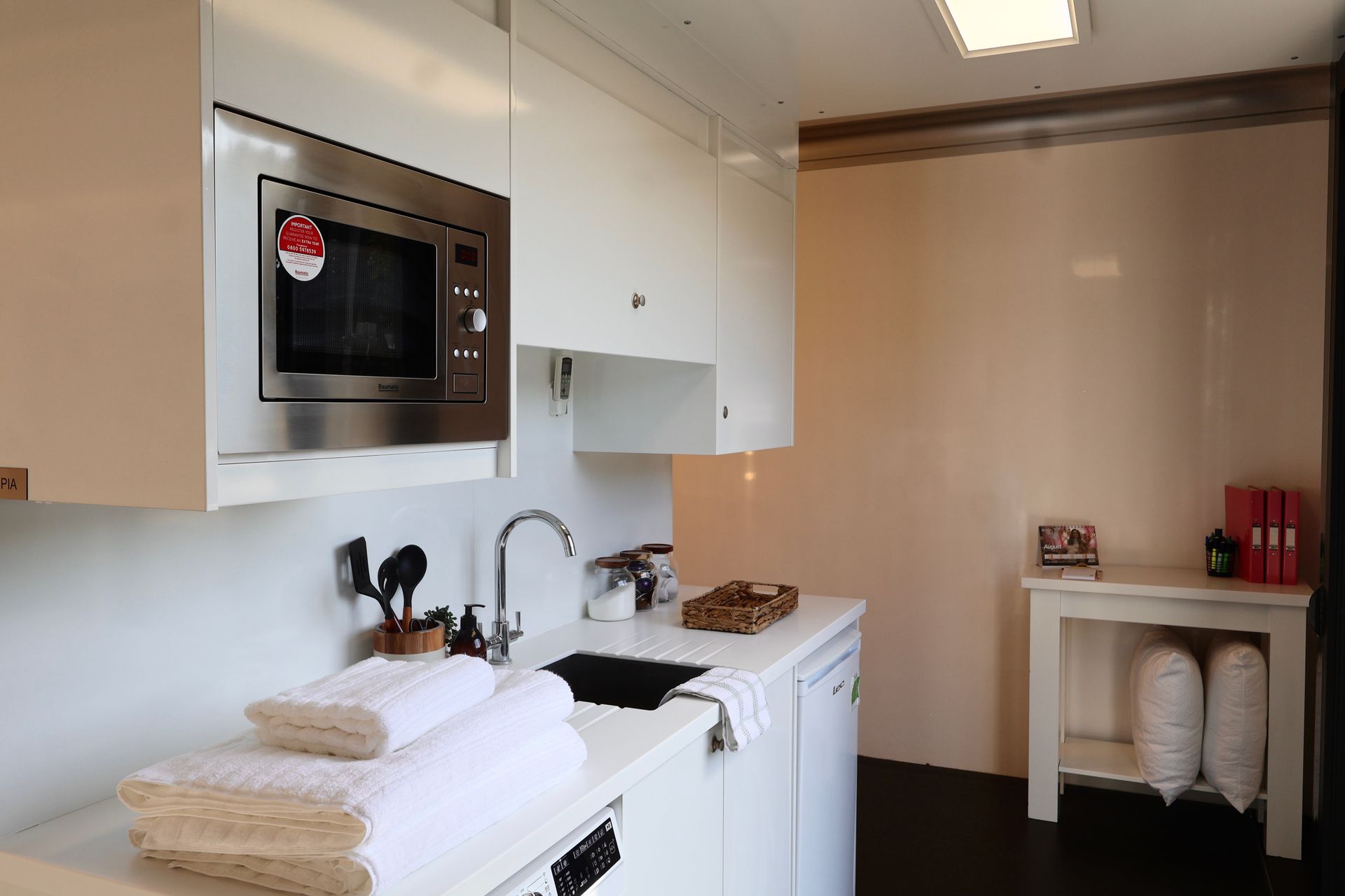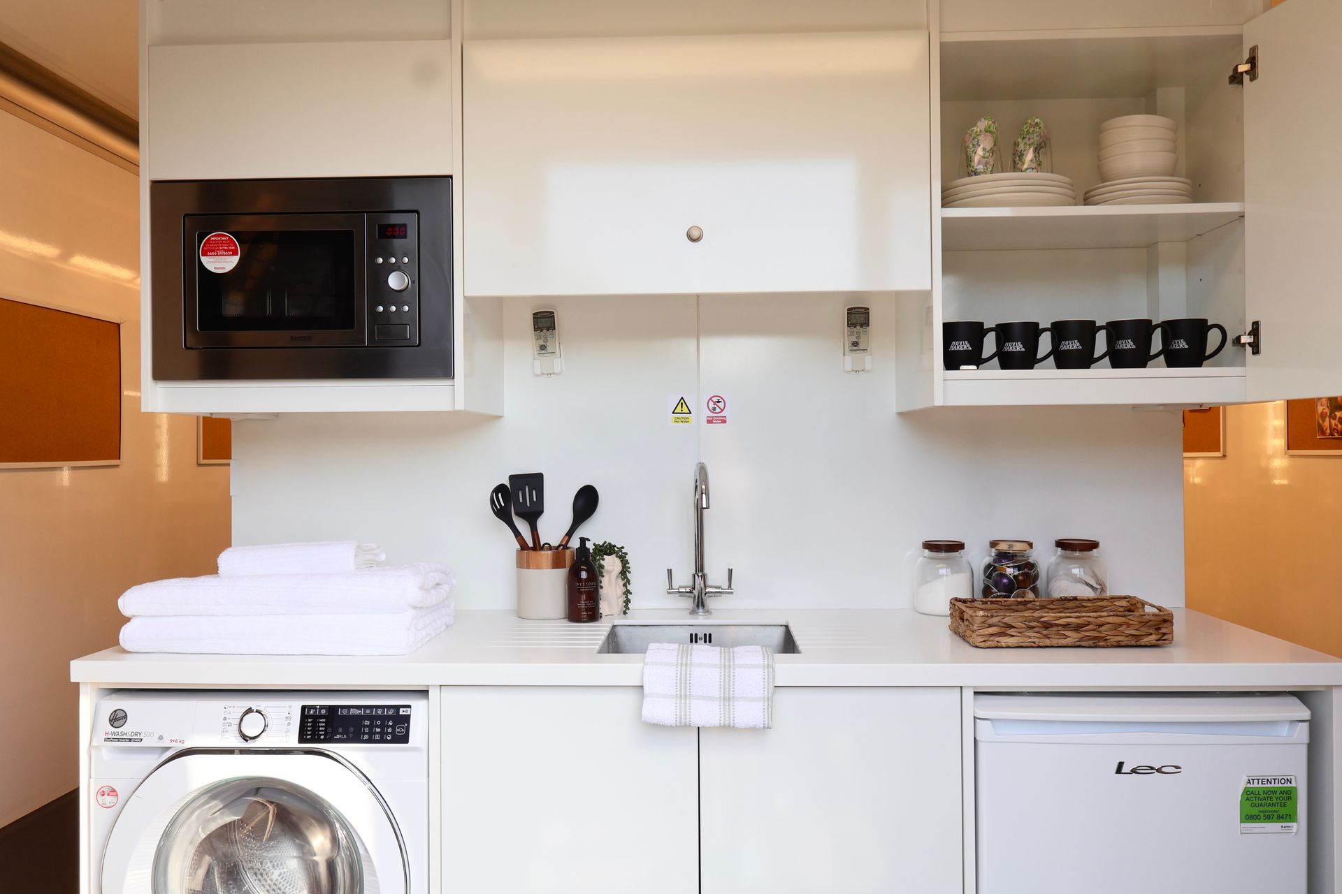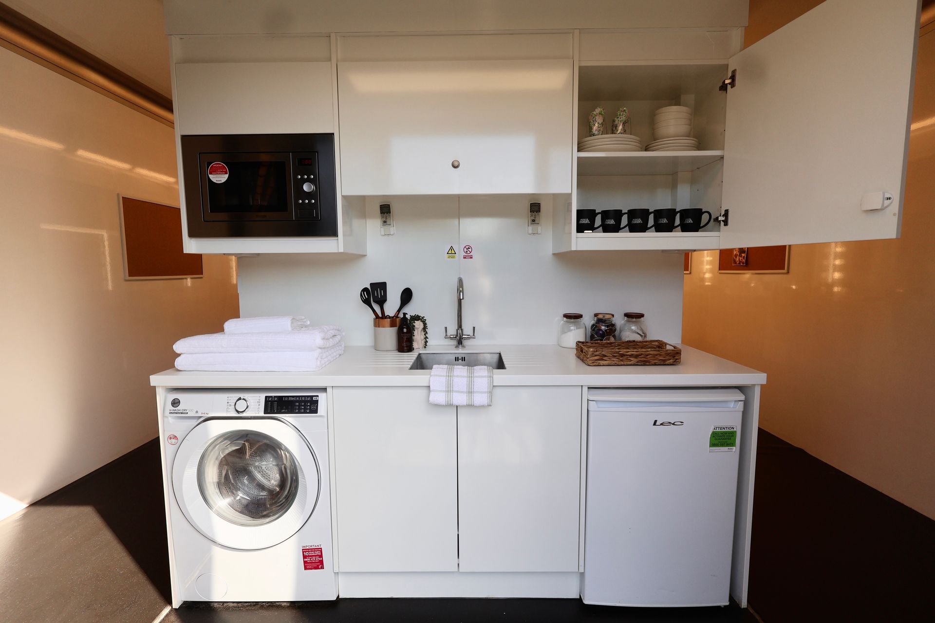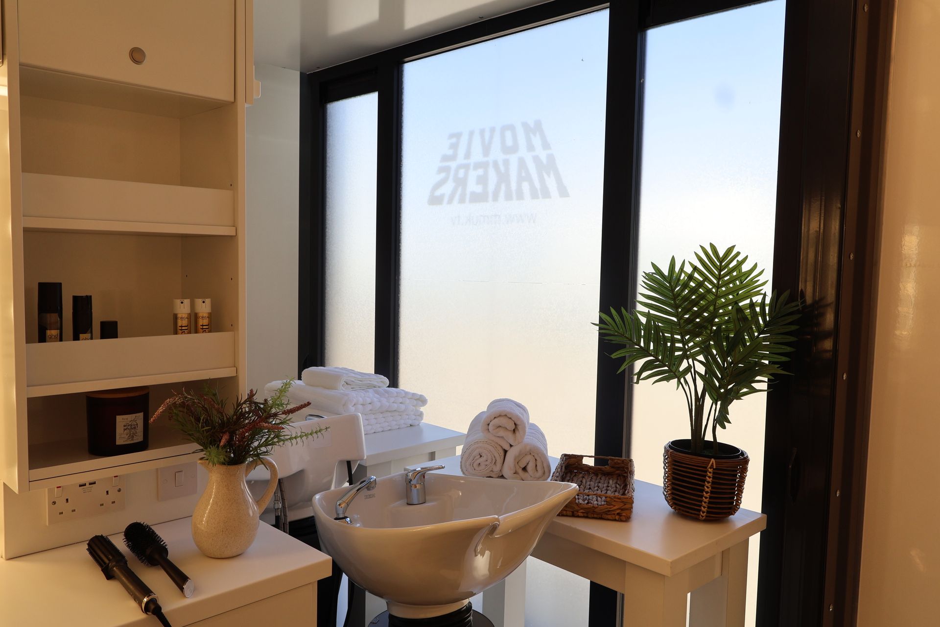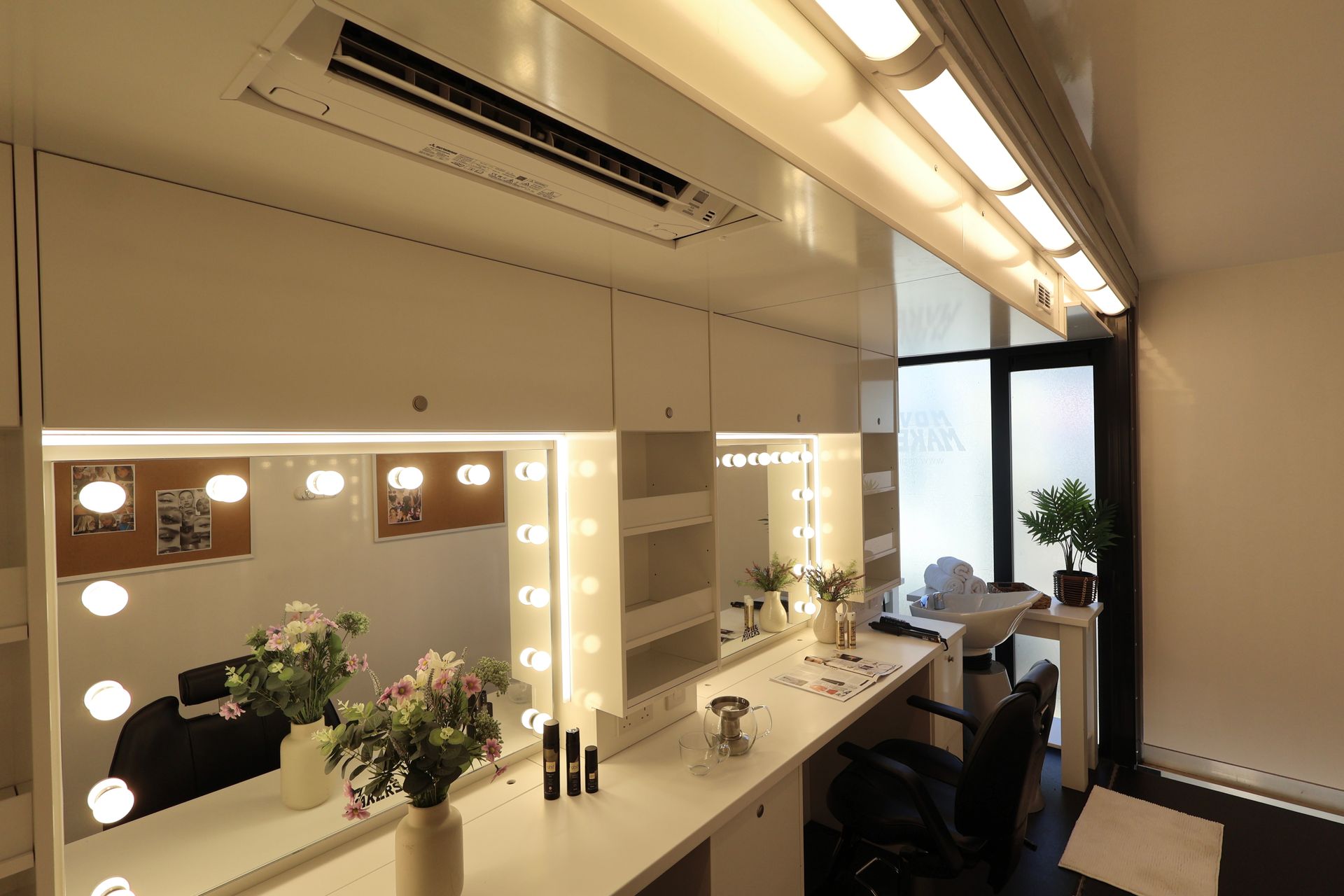 The 12 Position Make Up has 2 full length slide out giving a light and spacious environment. It has kitchen facilities, 2 back wash sinks and a washing machine.