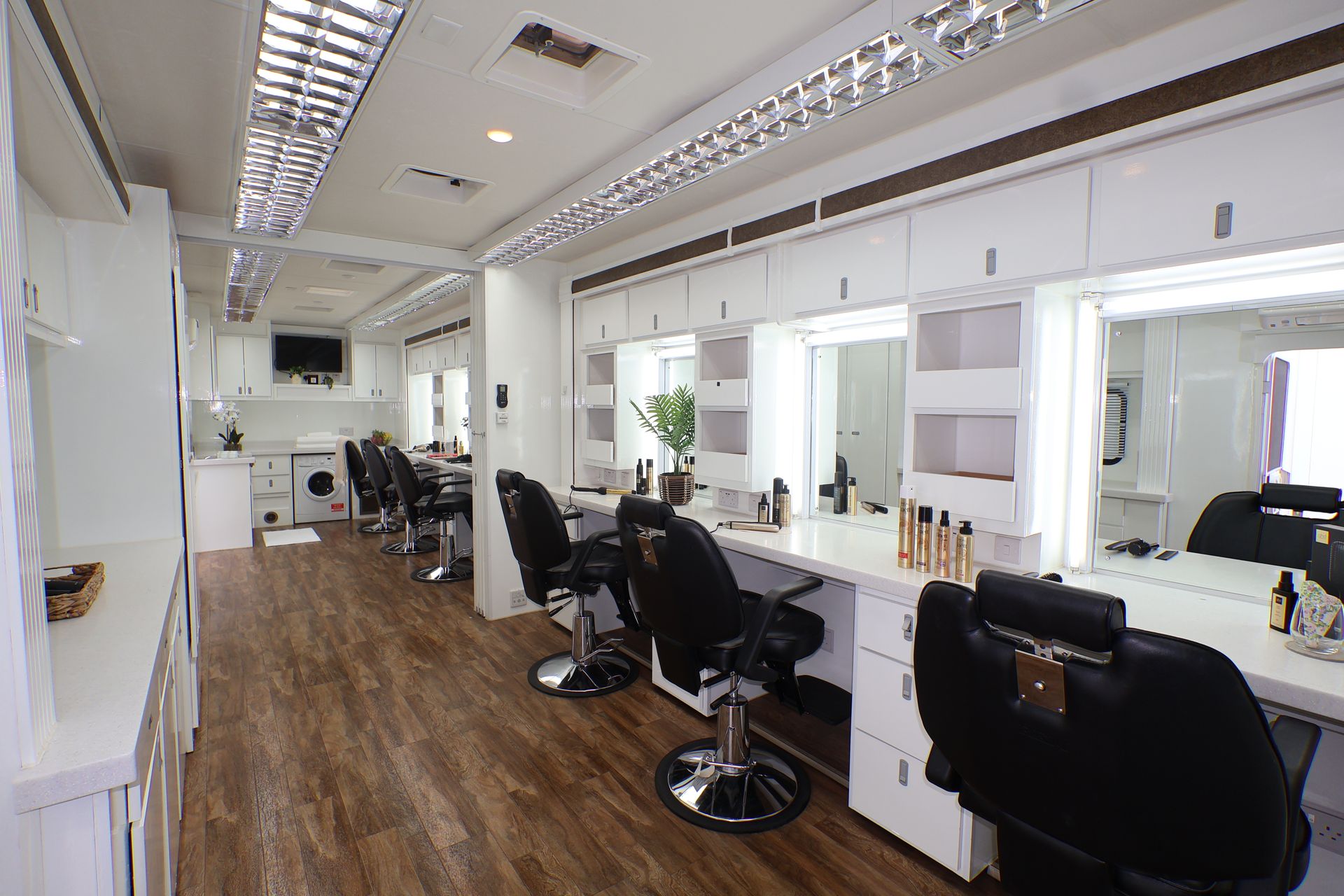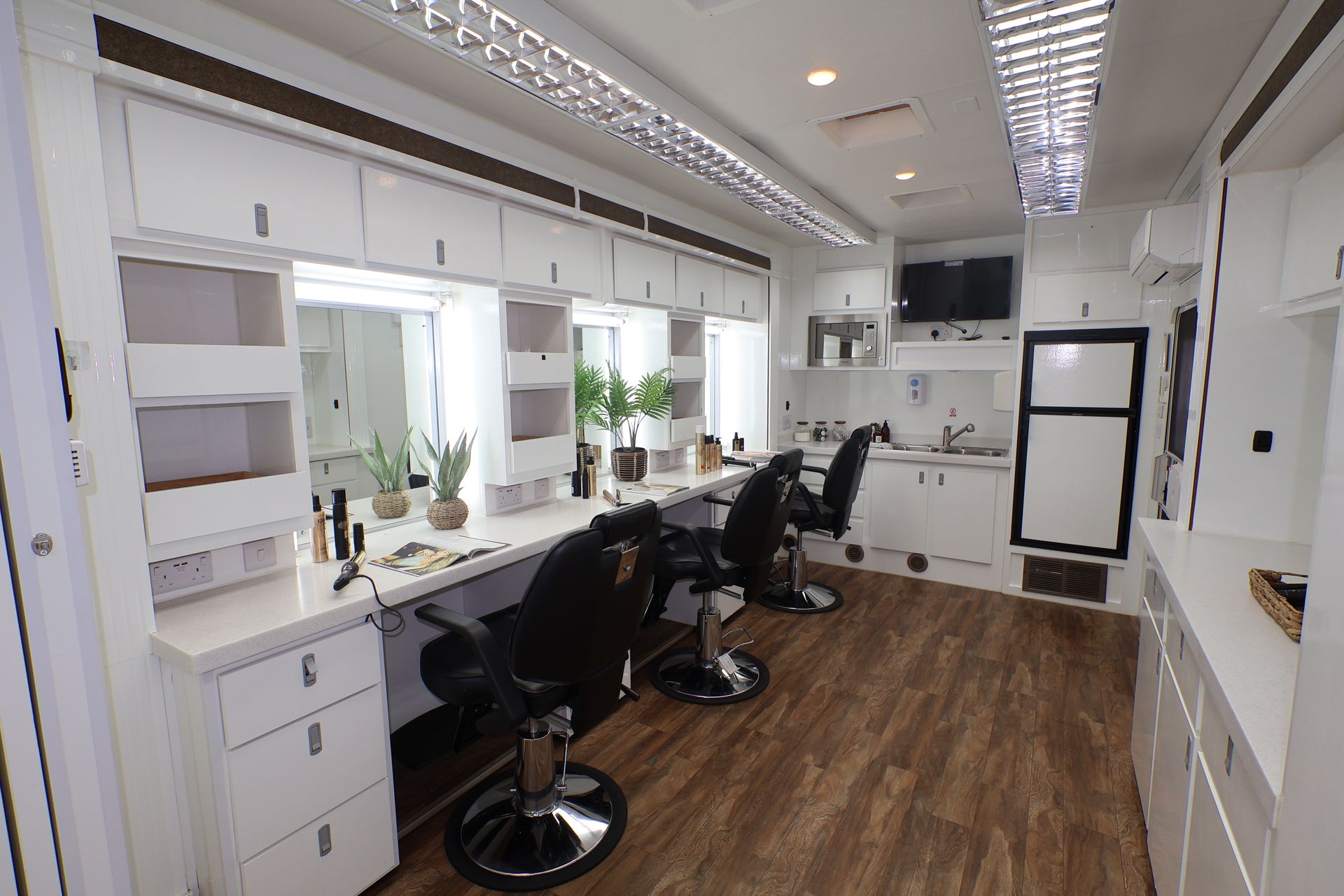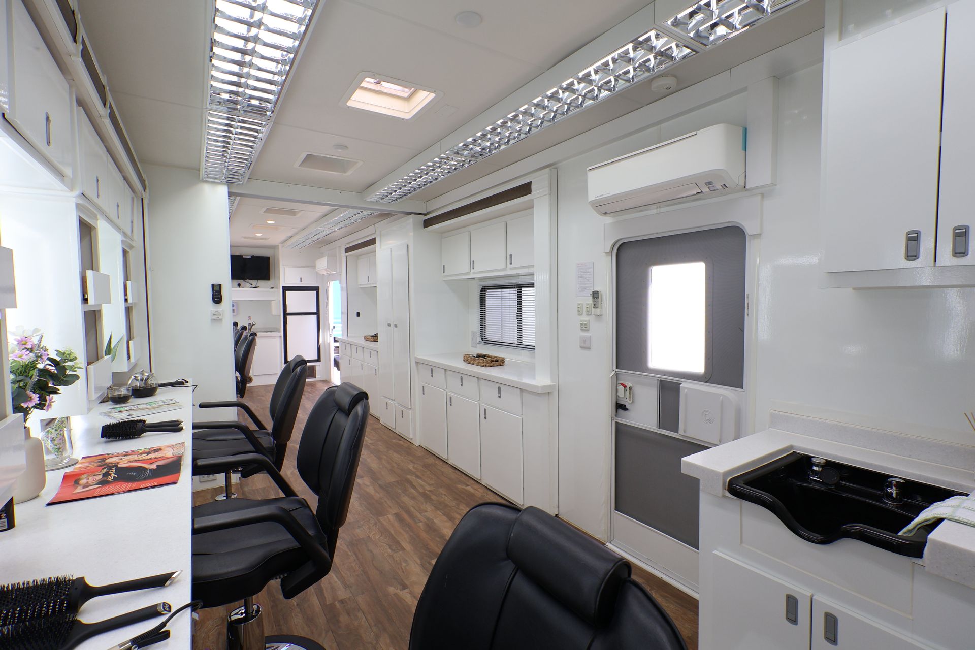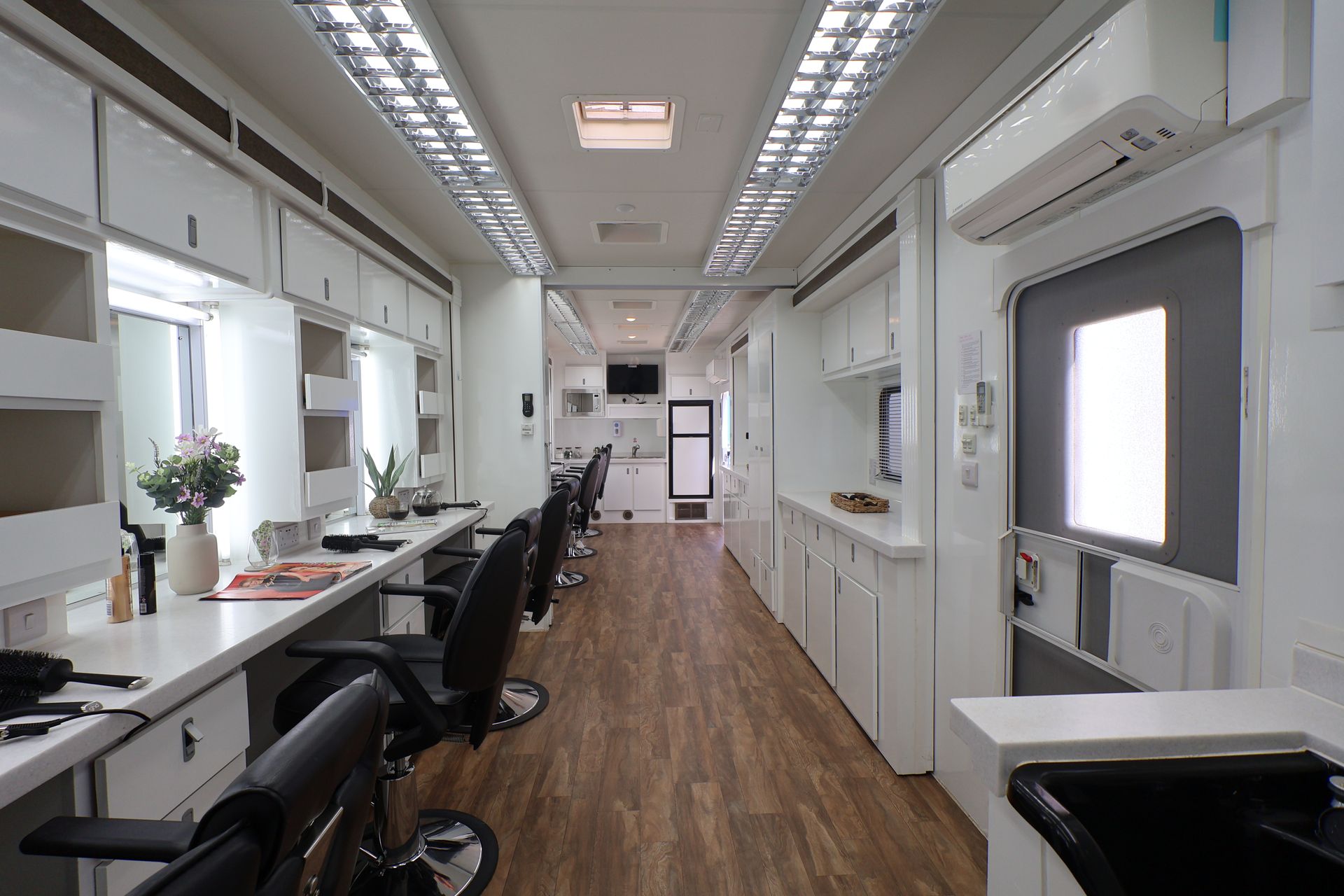 The 6 position make up with 3 slide-outs is spacious with the option of a centre partition door. We also have an alternative 35ft, 6 position trailer.