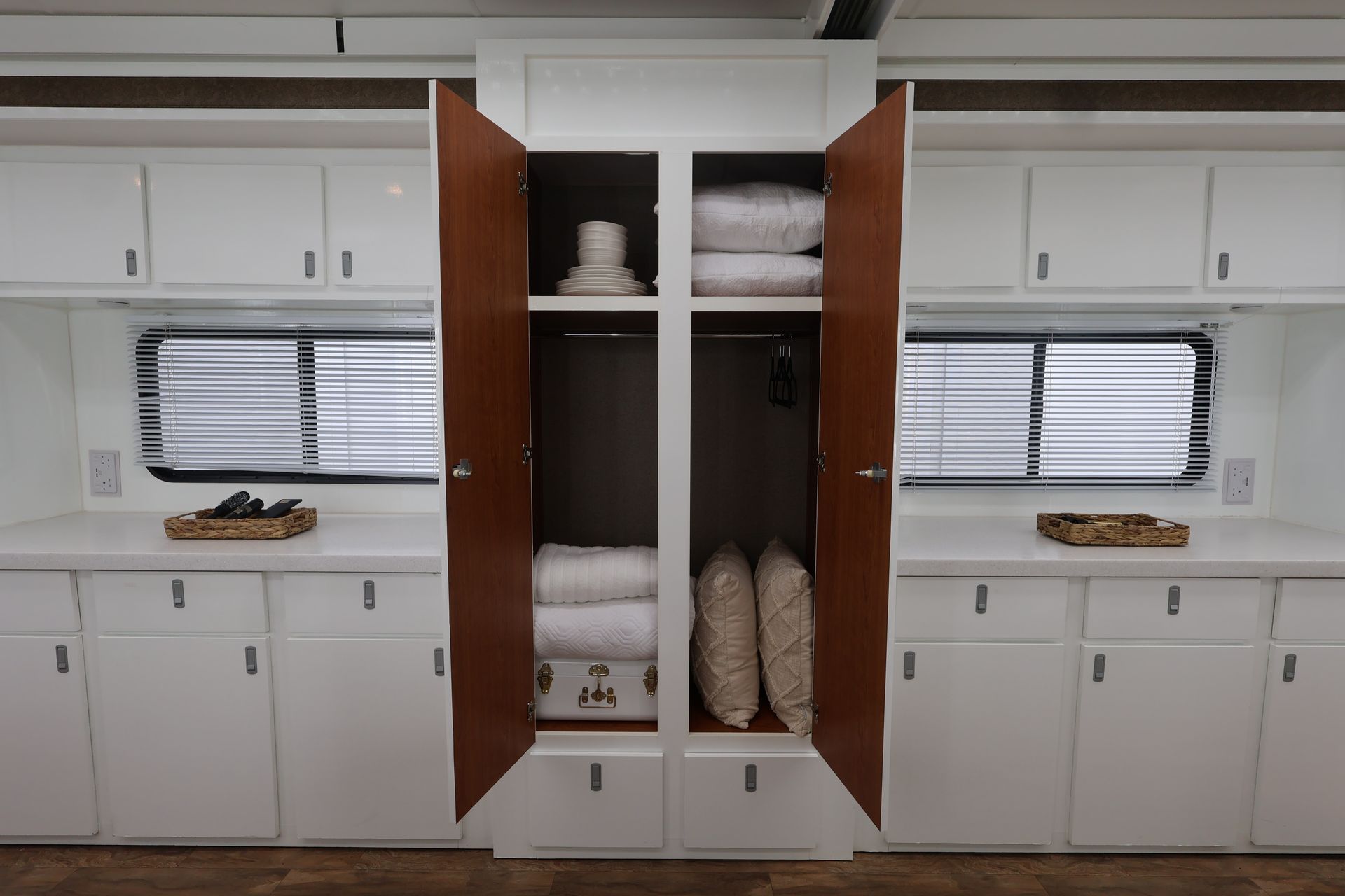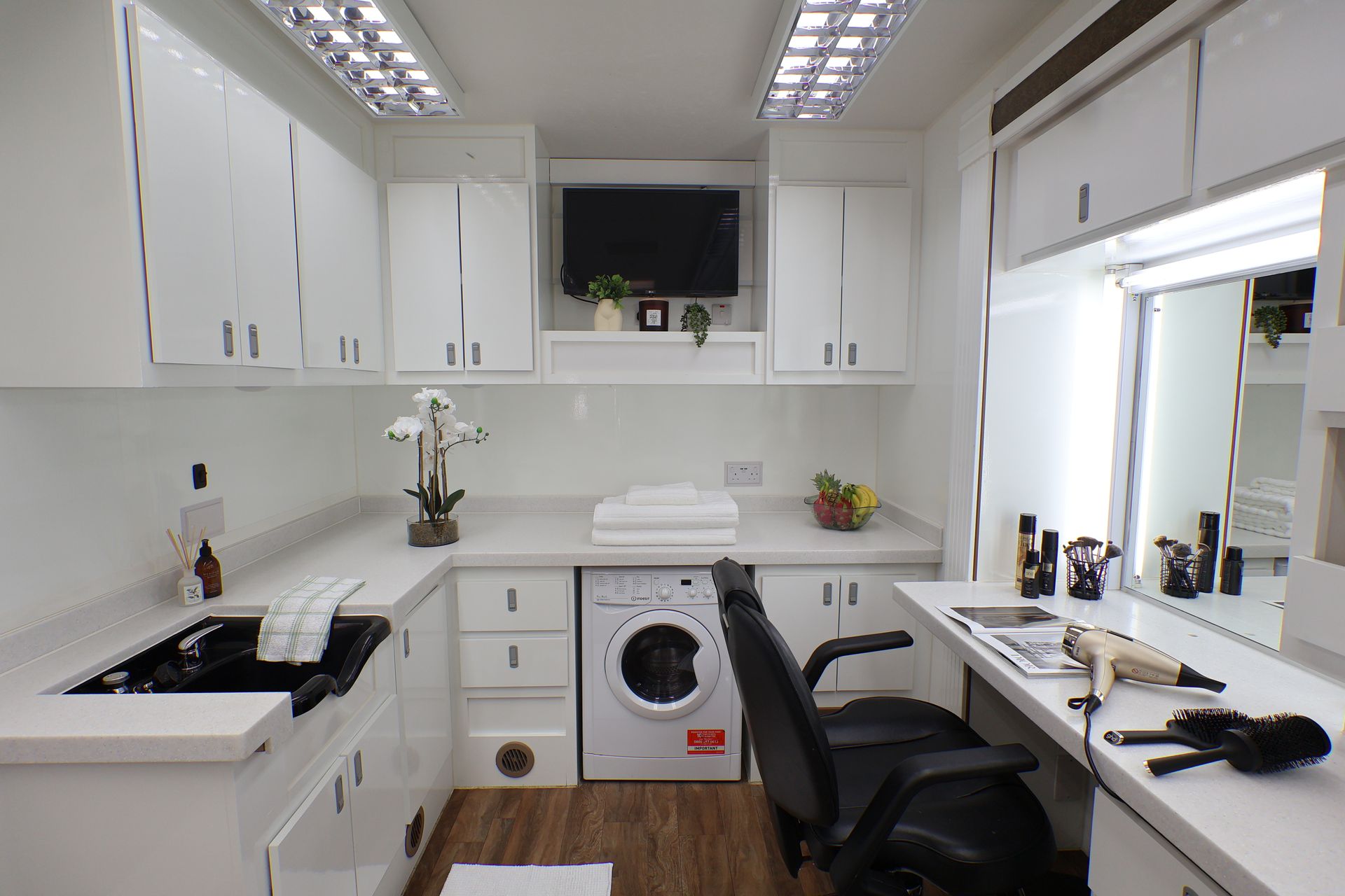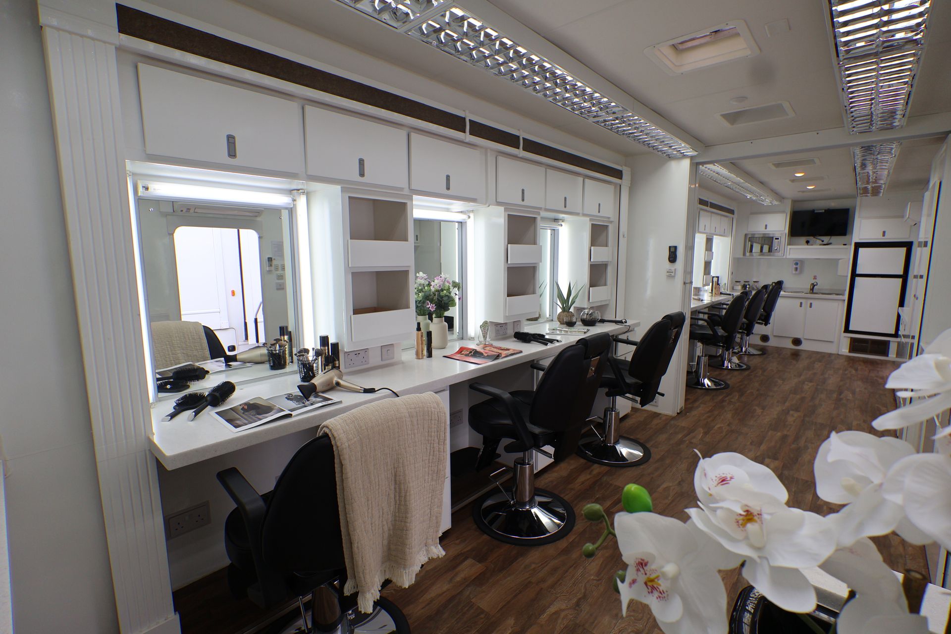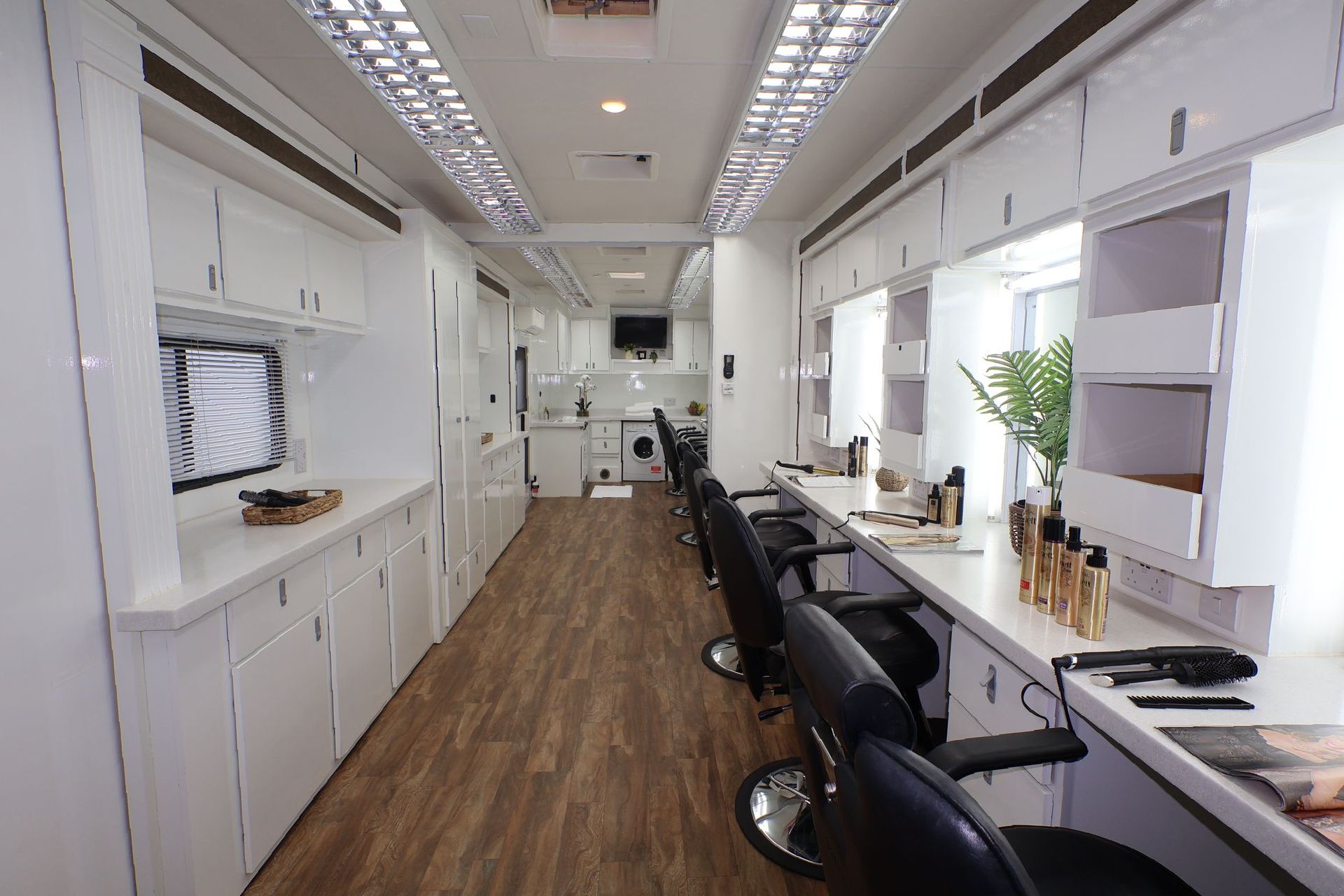 The 6 position make up with 3 slide-outs is spacious with the option of a centre partition door. We also have an alternative 35ft, 6 position trailer.