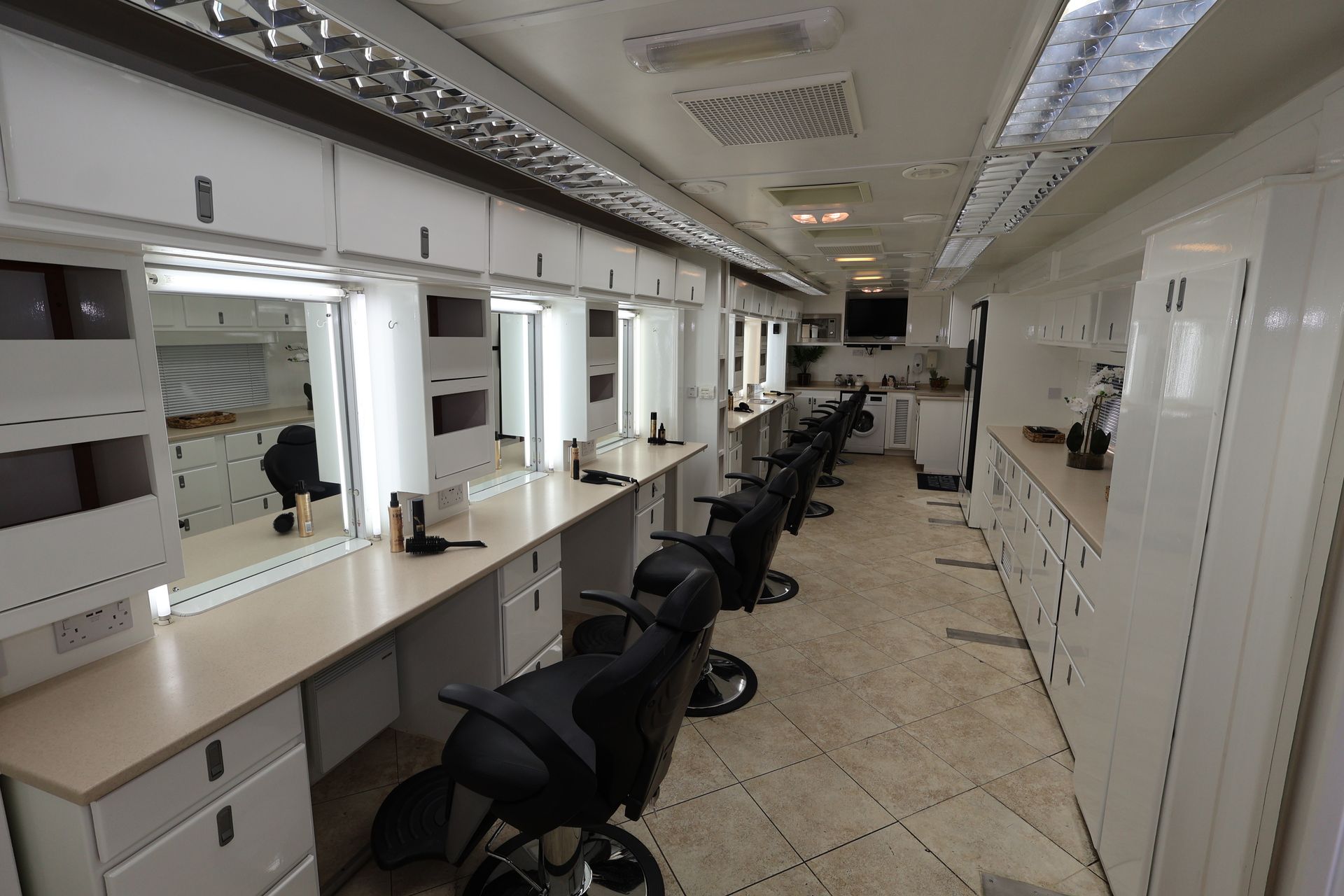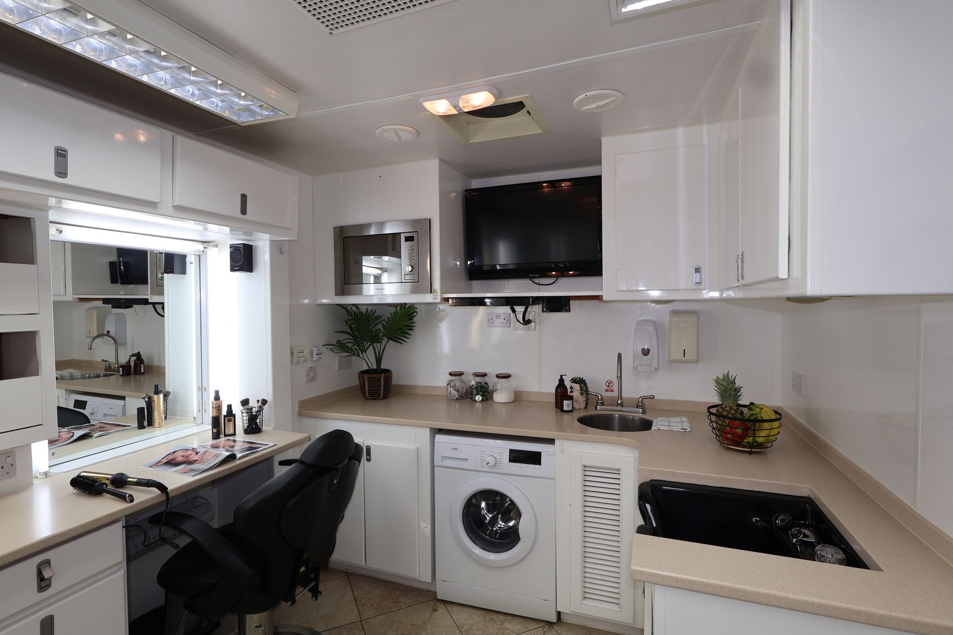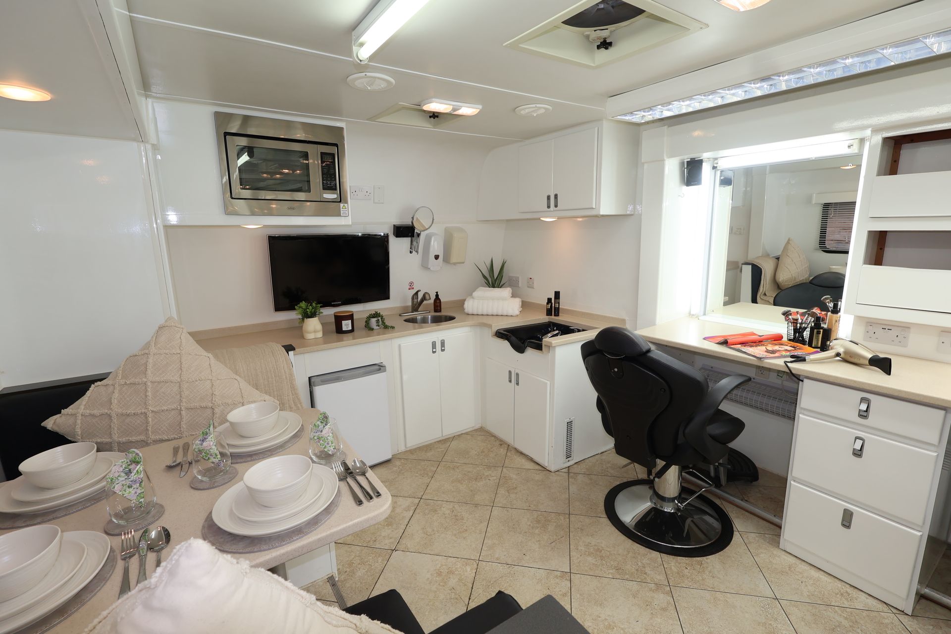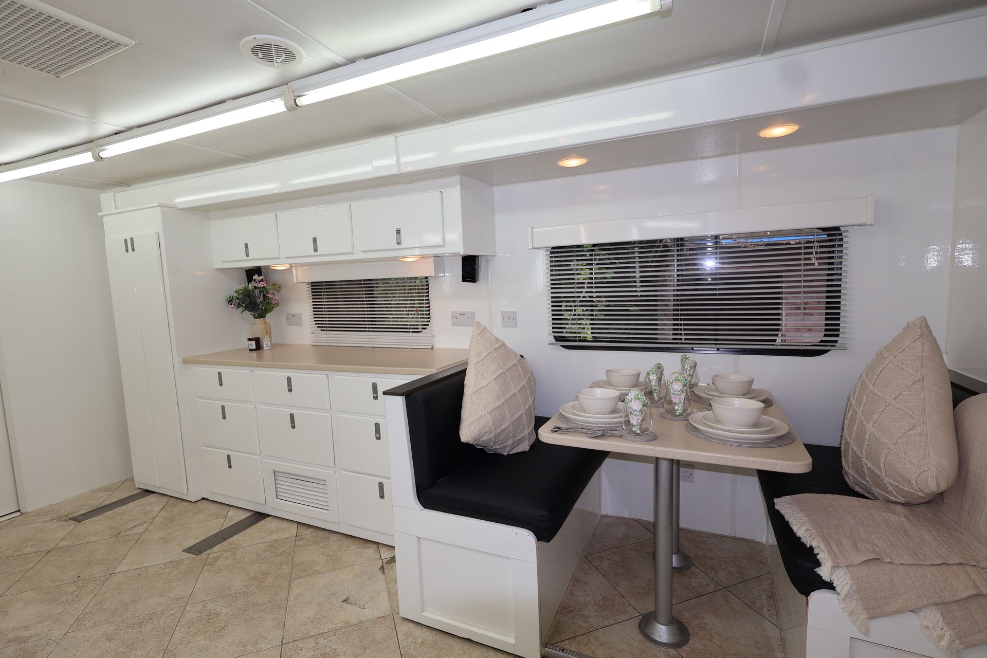 This split level 9 Position Make Up has 5 slide-outs giving a light and spacious environment. It has kitchen facilities and TV at each end together with 2 back wash sinks. It also features a diner booth. There is ample cupboard and wardrobe space and a washing machine.