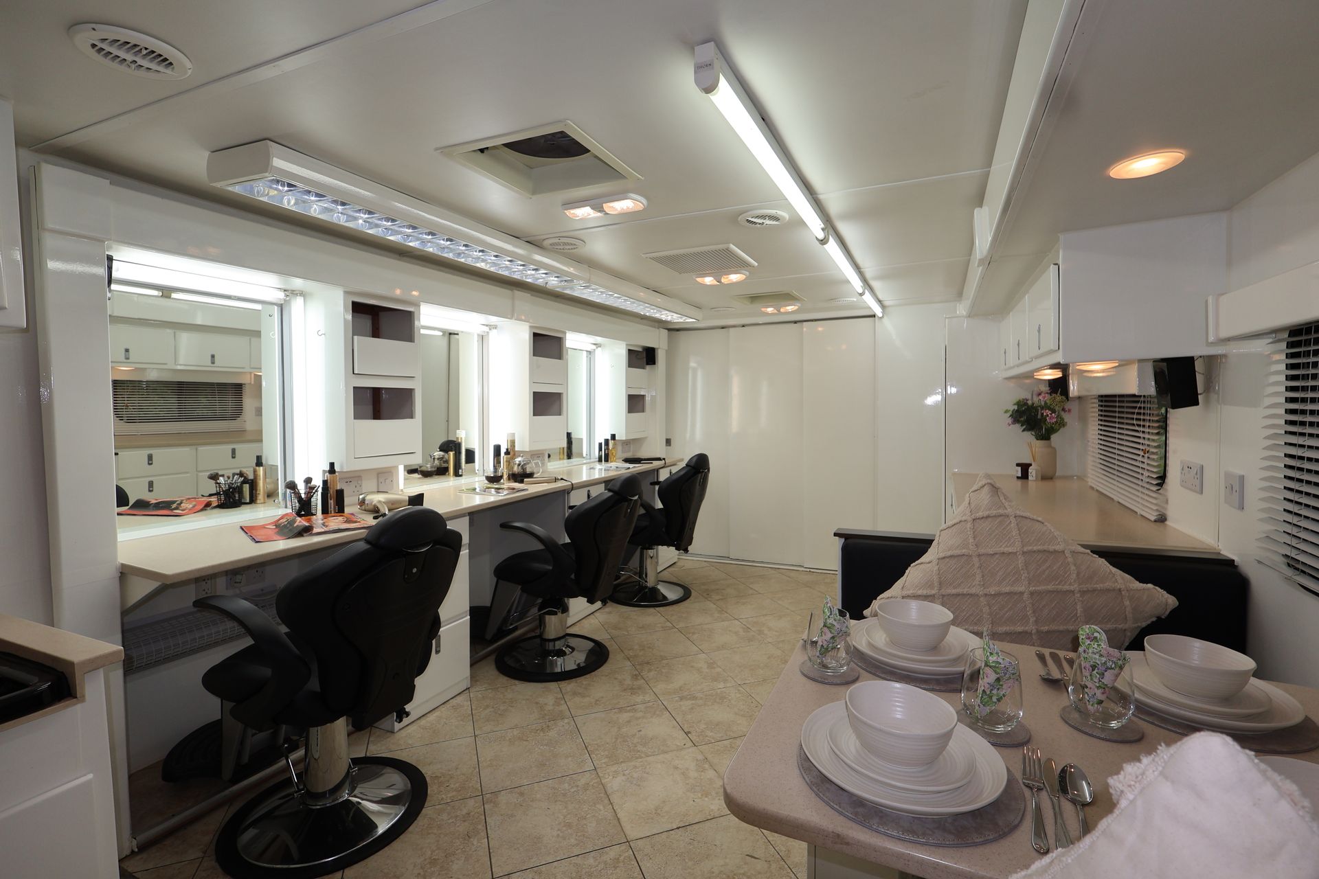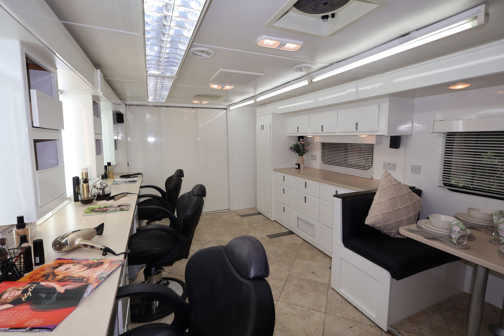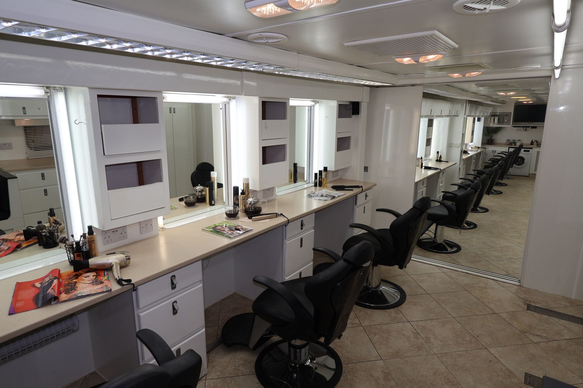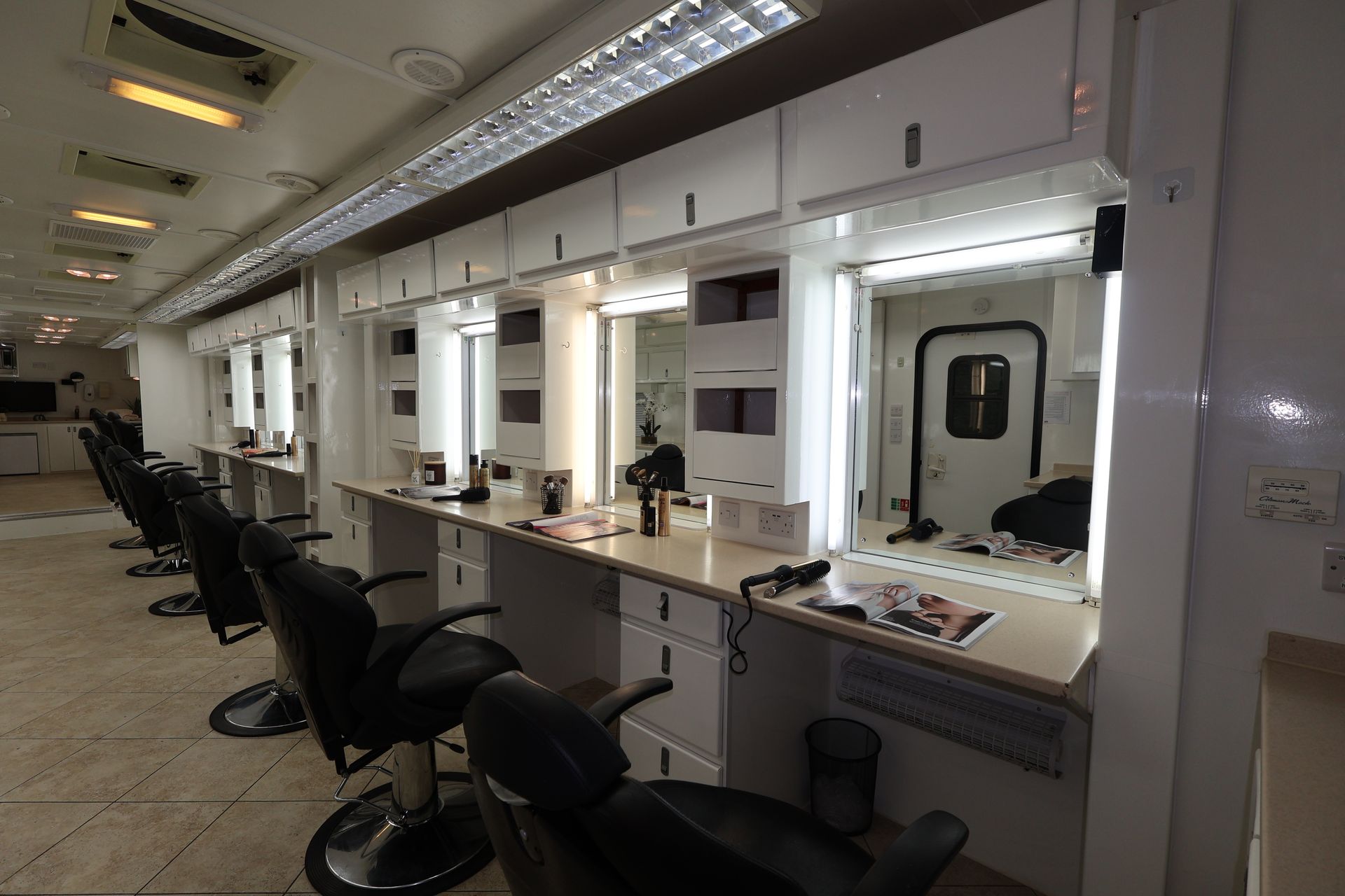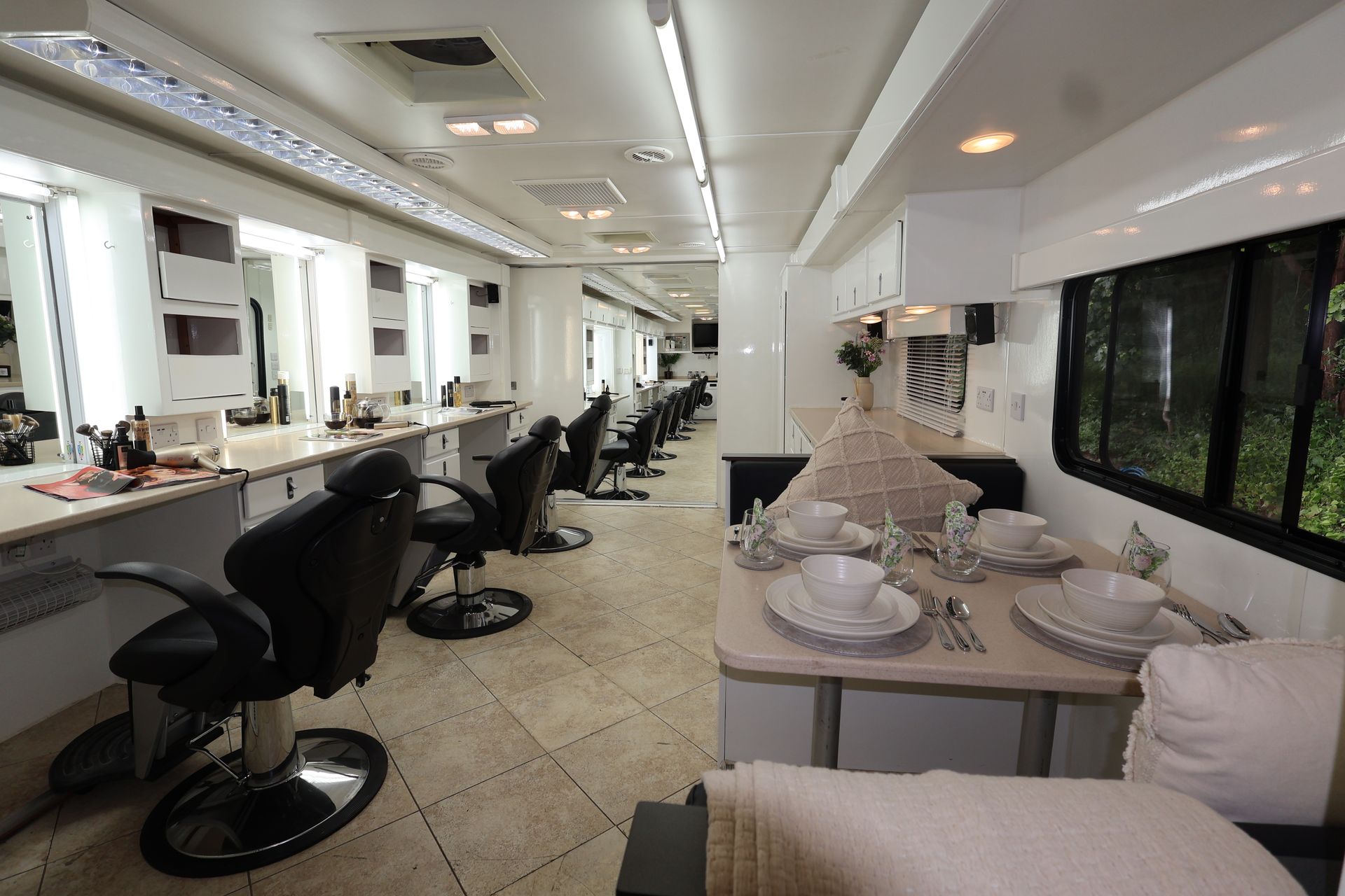 This split level 9 Position Make Up has 5 slide-outs giving a light and spacious environment. It has kitchen facilities and TV at each end together with 2 back wash sinks. It also features a diner booth. There is ample cupboard and wardrobe space and a washing machine.