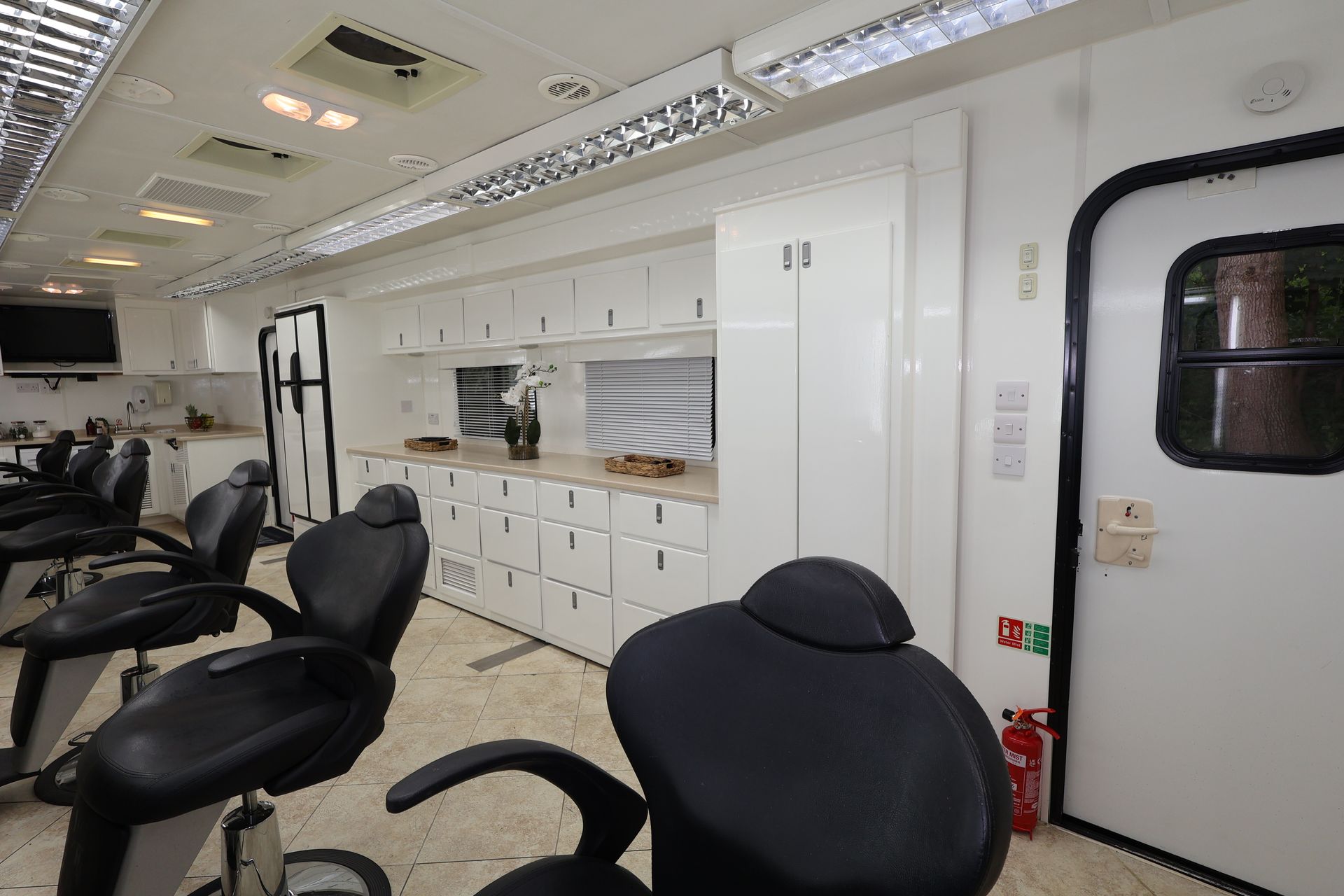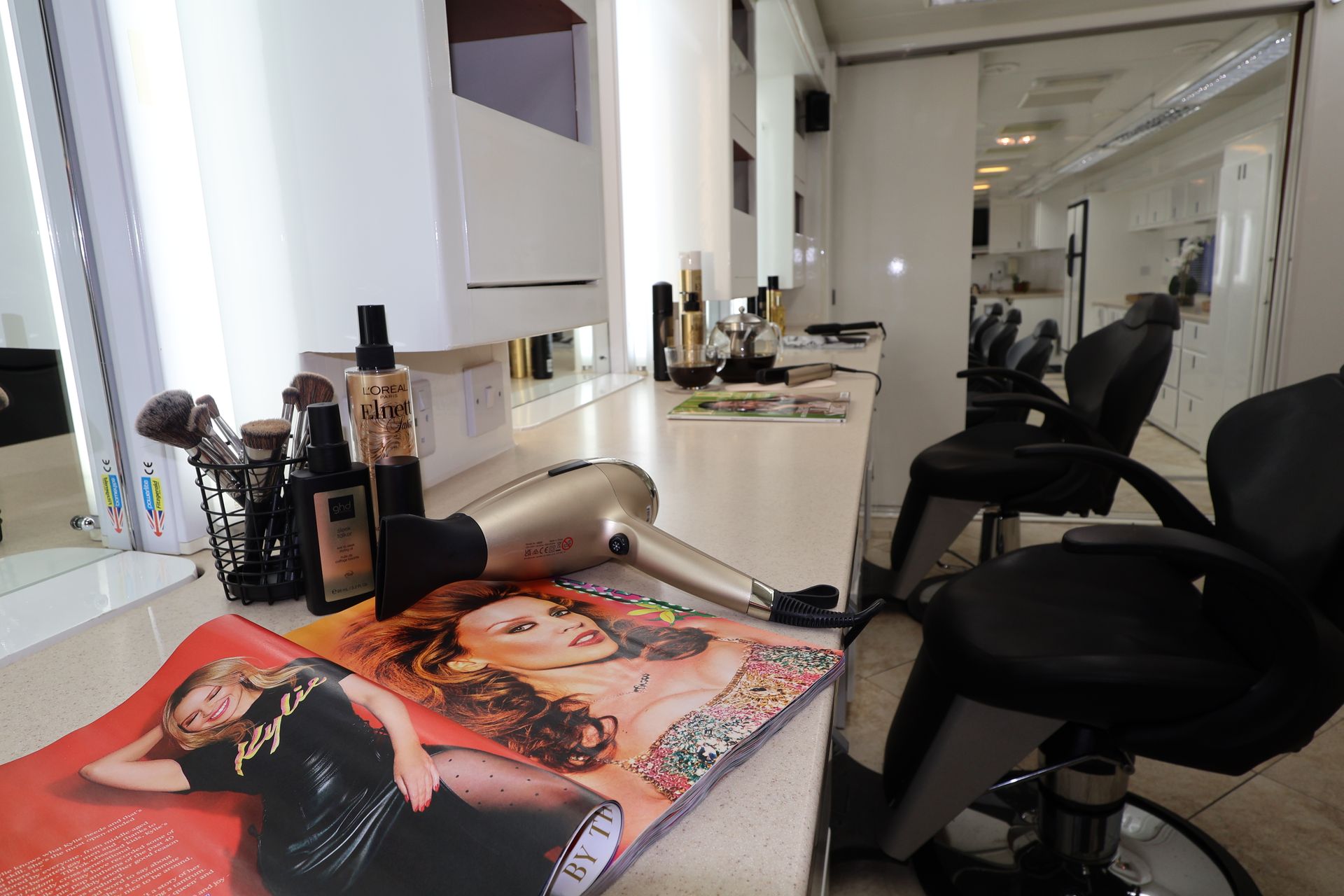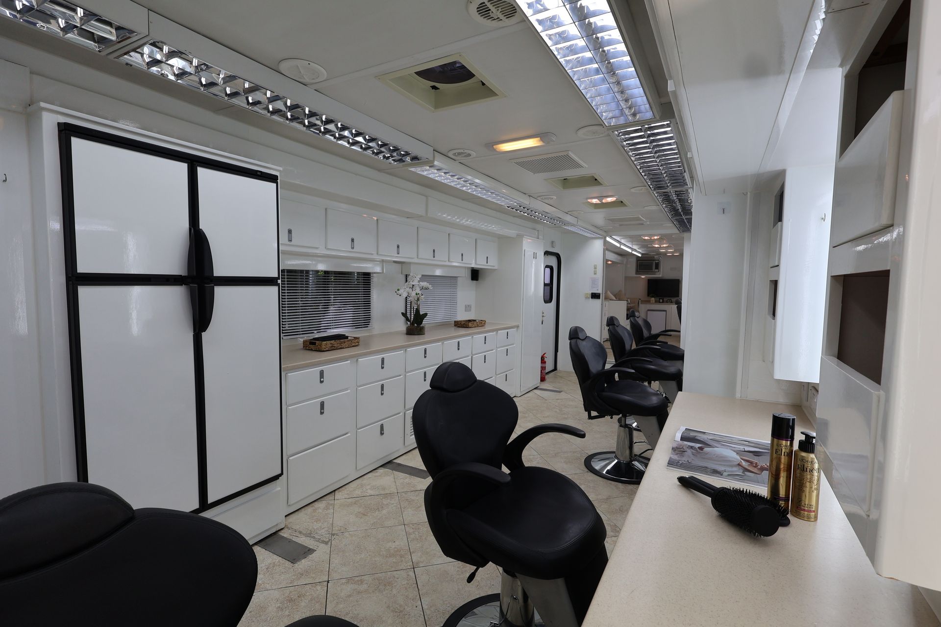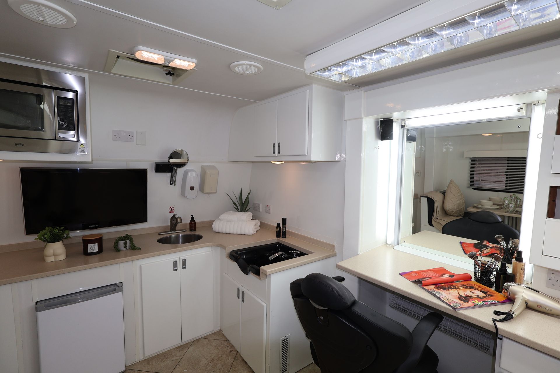 This split level 9 Position Make Up has 5 slide-outs giving a light and spacious environment. It has kitchen facilities and TV at each end together with 2 back wash sinks. It also features a diner booth. There is ample cupboard and wardrobe space and a washing machine.