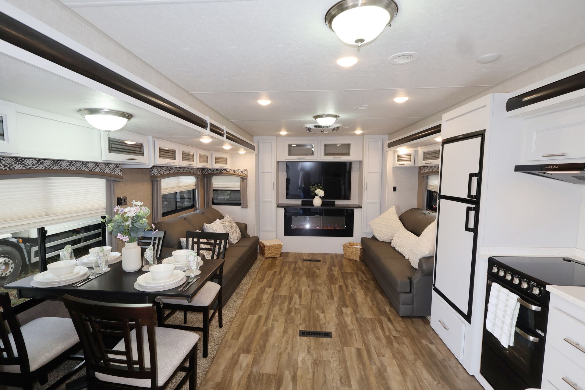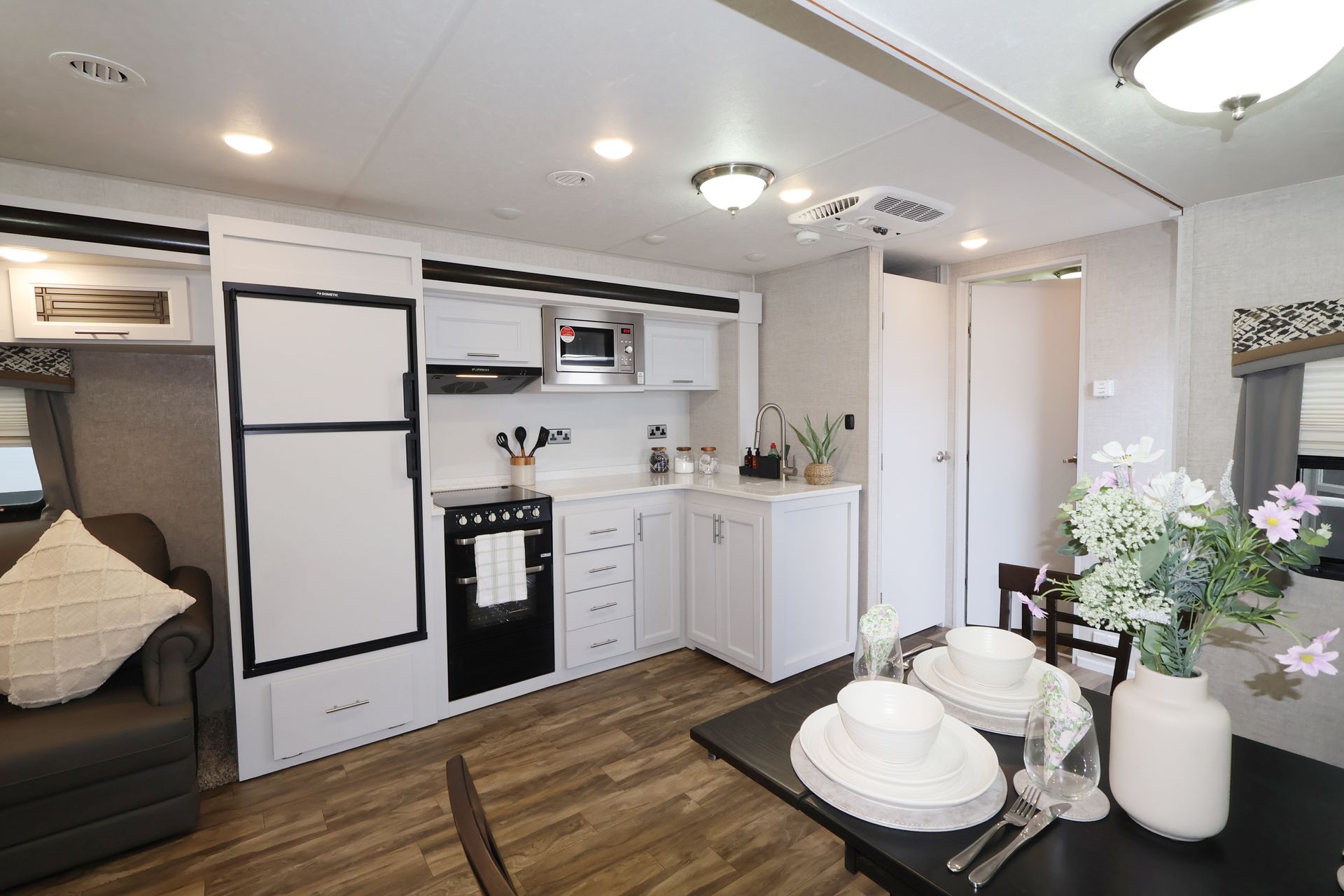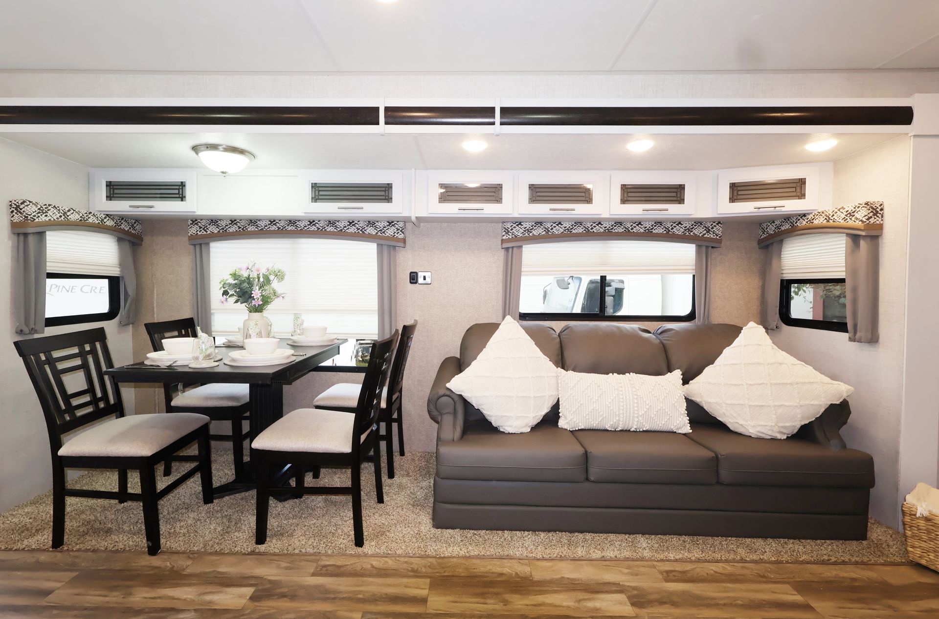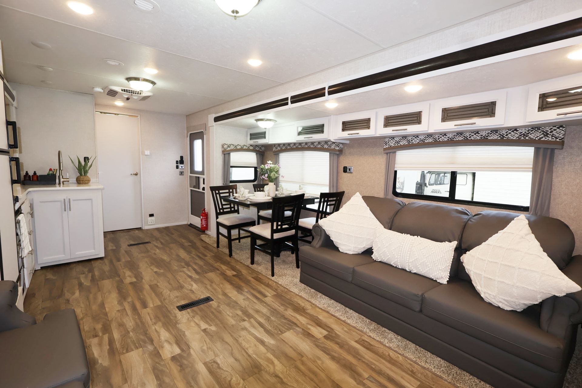 The Hyline is our largest travel trailer with a beautifully decorated interior and is packed with residential style features. This trailer gives you everything you are looking for in your home away from home.