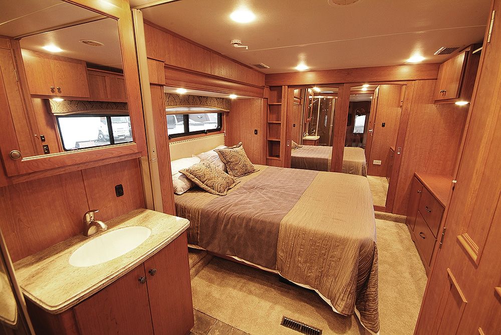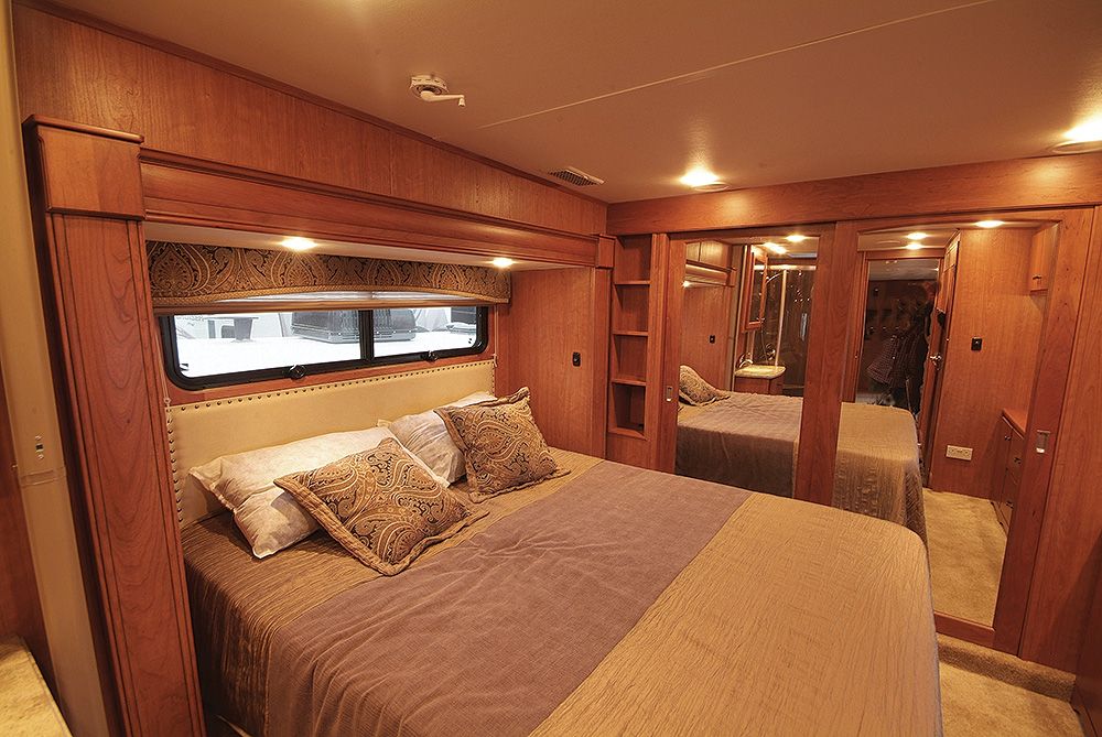 These 2 bedroom trailers have a living room with a 72" luxury hide-a-bed sofa, 2 luxury recliners, a free standing dining table and chairs, pull-out desk at entertainment centre, 3 zone halogen lighting with dimmer switches and a ceiling fan.