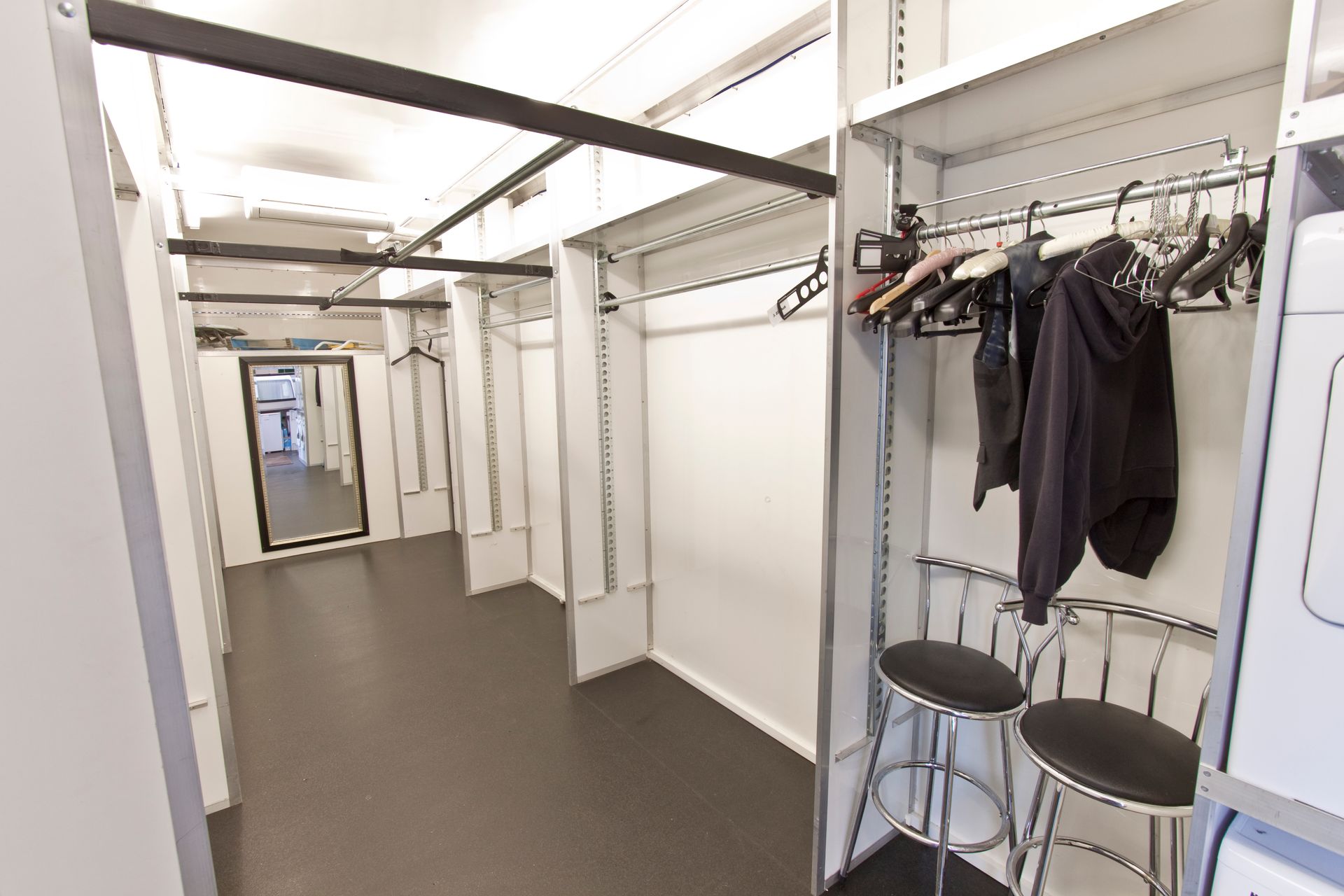 Our Rigid Wardrobes offer the hanging space and washing facilities needed in many fields of media production. There is also a kitchen area at the rear.