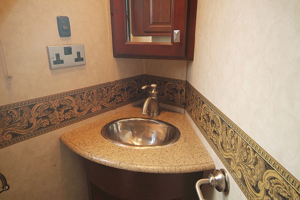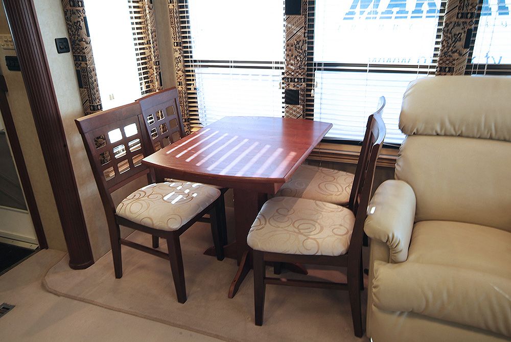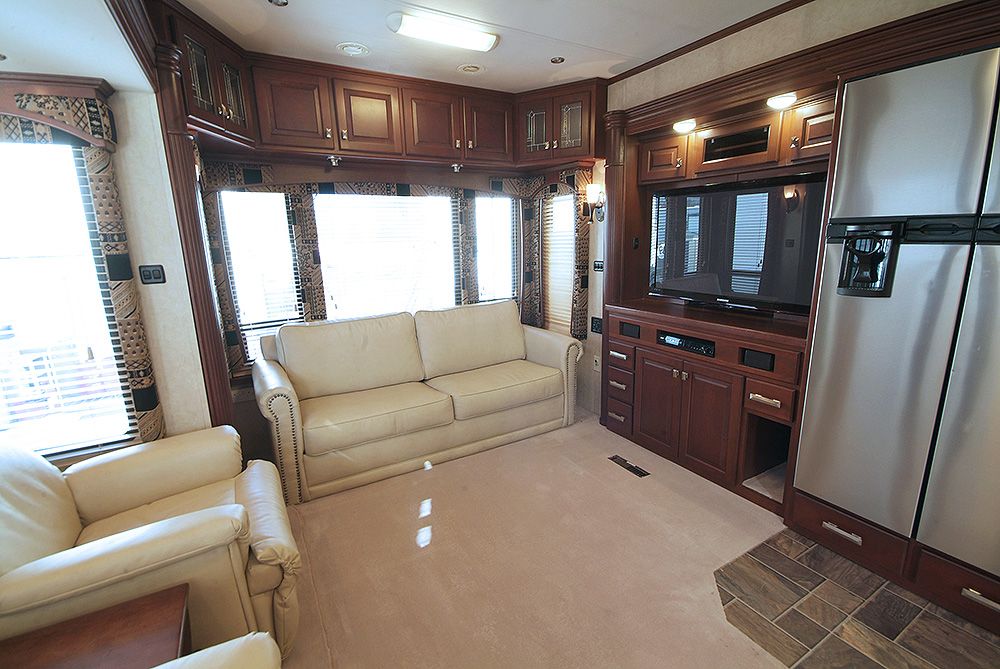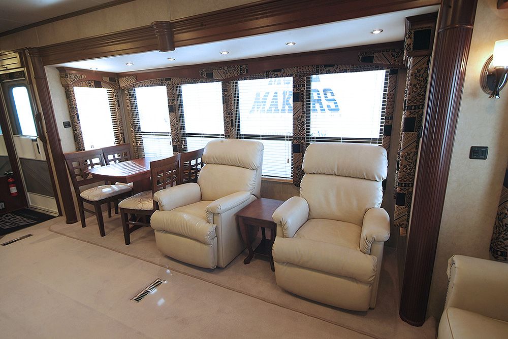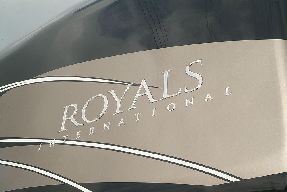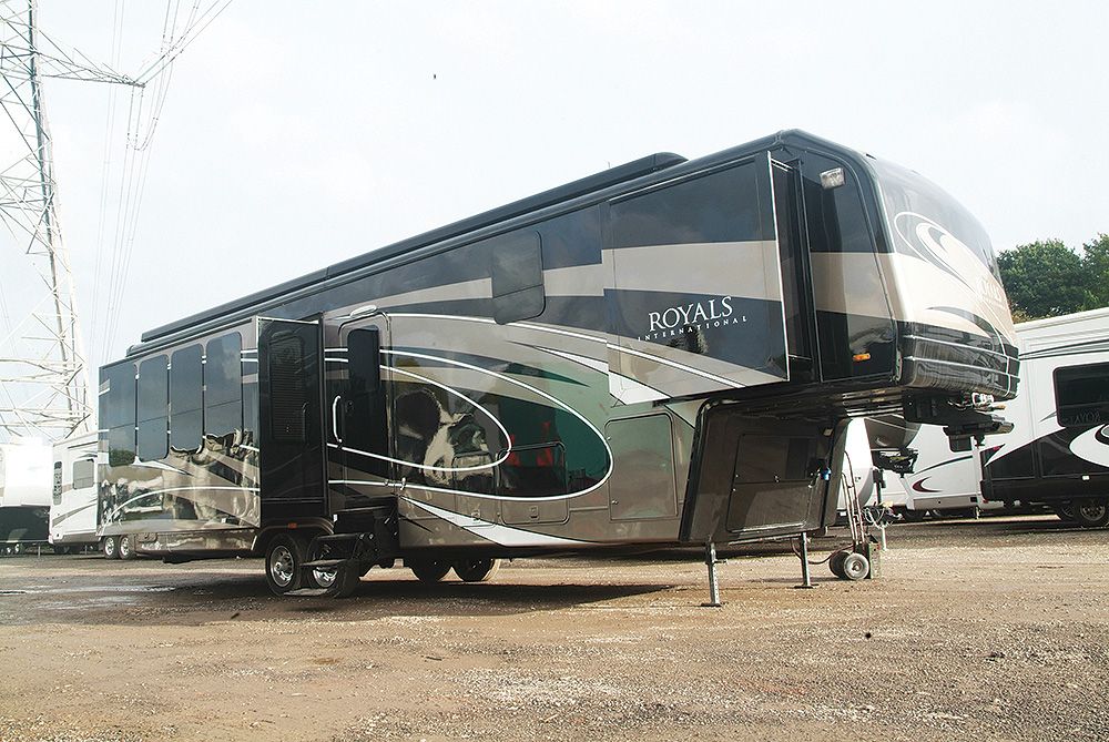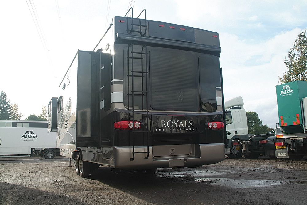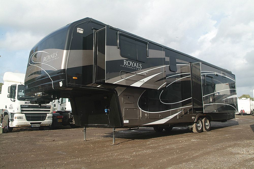 The Royals International is a 1 bedroom, luxury trailer with 4 slide outs. It has 2 armchairs, sofa, free standing dining table and chairs and entertainment centre.